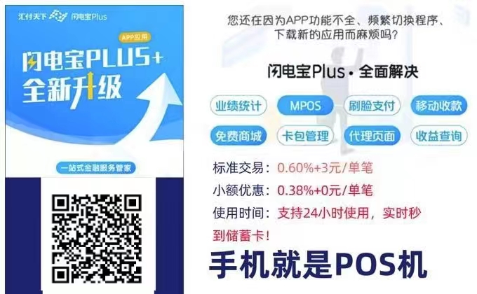 閃電寶PLUS是上市公司匯付天下旗下的產(chǎn)品,業(yè)內(nèi)顛覆出品,閃電寶PLUS打開APP就能收款,操作方便,匯付天下,上市公司,行業(yè)口碑最好,銀聯(lián)正規(guī)一清,公司直營(yíng)產(chǎn)品,小額費(fèi)率0.23-0.38;收款0.53-0.58,只用無卡0成本,手機(jī)就是收款機(jī),無卡不夠刷或者需要刷別人的卡就在APP下單自己買機(jī)子。