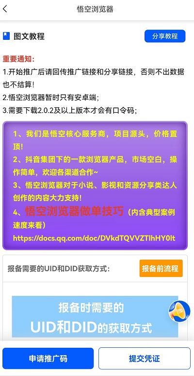 注冊之后,我們首頁置頂項目就可以找到【悟空瀏覽器】,然后點擊申請報備,注意報備成功之后,所謂的推廣碼就是我們專輯的分享鏈接和口令,要通過之后才有拉新收益,具體操作流程和注意事項包括案例,平臺任務里都會有說明。LOe菜譜美食網(wǎng)-眾歸云 - 24小時不關機的云端電腦_云主機_VPS掛機寶_免費掛機寶_0.1元試用,3-5元月租服務器提供
