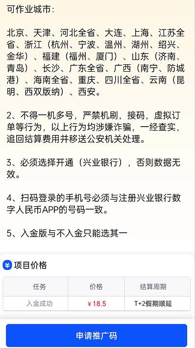 如果大家想要對接興業(yè)數(shù)字人民幣的地推項(xiàng)目,直接在興業(yè)銀行APP里面是找不到入口的,大家可以注冊任推邦,通過任推邦公司邀請碼12345678進(jìn)行注冊即可成為平臺的一級代理,然后進(jìn)入平臺首頁下拉即可找到興業(yè)數(shù)幣這個(gè)項(xiàng)目,因?yàn)榈赝祈?xiàng)目有時(shí)效性,如果時(shí)間太久就可能下架,大家也可以看下其他地推的任務(wù),進(jìn)入興業(yè)數(shù)幣入金版點(diǎn)擊申請推廣碼,通過之后就可以開始作業(yè)了。oir菜譜美食網(wǎng)-眾歸云 - 24小時(shí)不關(guān)機(jī)的云端電腦_云主機(jī)_VPS掛機(jī)寶_免費(fèi)掛機(jī)寶_0.1元試用,3-5元月租服務(wù)器提供