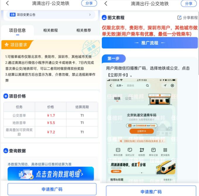 我們打開任推邦,找到【滴滴出現(xiàn)公交地鐵】任務(wù),然后申請獨立推廣碼即可開始掙米,后續(xù)結(jié)算和體線都是在任推邦A(yù)PP內(nèi)完成,老牌軟件不需要擔心結(jié)算到賬的問題。zZk菜譜美食網(wǎng)-眾歸云 - 24小時不關(guān)機的云端電腦_云主機_VPS掛機寶_免費掛機寶_0.1元試用,3-5元月租服務(wù)器提供