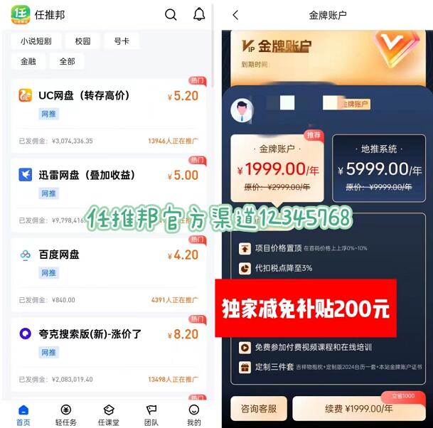 任推邦金牌賬戶需要費(fèi)用是1999元/每年(這邊的公司渠道12345678聯(lián)系進(jìn)群可以額外返現(xiàn)200補(bǔ)貼),注意這個(gè)是每年的費(fèi)用不是永久的,開通之后里面部分任務(wù)價(jià)格會(huì)高一些,另外扣稅從5%降低到3%,個(gè)人大概算了一下推廣任務(wù)收入1萬(wàn)的話大概可以提升3-5百元吧,另外就是里面有些付費(fèi)課程對(duì)部分用戶還是有些價(jià)值的,如果從收益的角度來(lái)看,普通用戶是沒必要開通升級(jí)的,畢竟大部分任務(wù)價(jià)格是一樣,個(gè)別價(jià)格有差異的實(shí)際上區(qū)別并不會(huì)很大,本身任推邦普通用戶價(jià)格就已經(jīng)很高了,不完全準(zhǔn)確的計(jì)算大概我們每年收入5w+的話可以考慮開通金牌,否則的話沒必要,而且5萬(wàn)的話也是就持平左右也沒必要,實(shí)際上個(gè)人建議起碼每天收益平均300-500元以上再考慮即可(不包括團(tuán)隊(duì)收益,提成是不會(huì)提升的)。SRl菜譜美食網(wǎng)-眾歸云 - 24小時(shí)不關(guān)機(jī)的云端電腦_云主機(jī)_VPS掛機(jī)寶_免費(fèi)掛機(jī)寶_0.1元試用,3-5元月租服務(wù)器提供