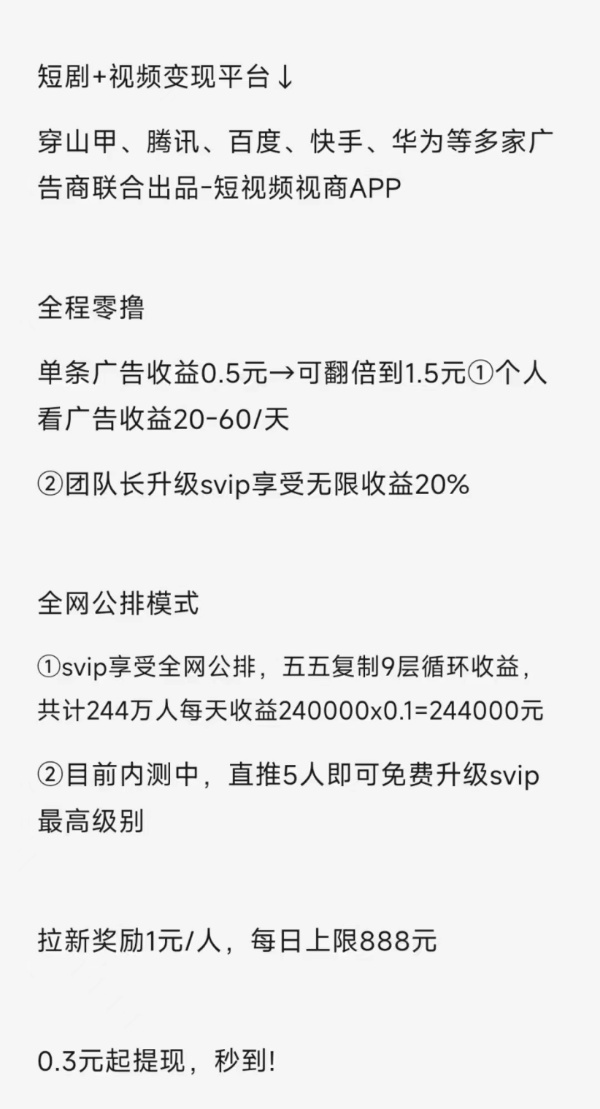 九條渠道,一個(gè)渠道15個(gè)廣告,一天135條就逮著廣告看一天20元-60元 去完成養(yǎng)機(jī)養(yǎng)的好一天60元 養(yǎng)不好也有20元,注冊(cè)了先別急著看廣告找我拿養(yǎng)機(jī)教