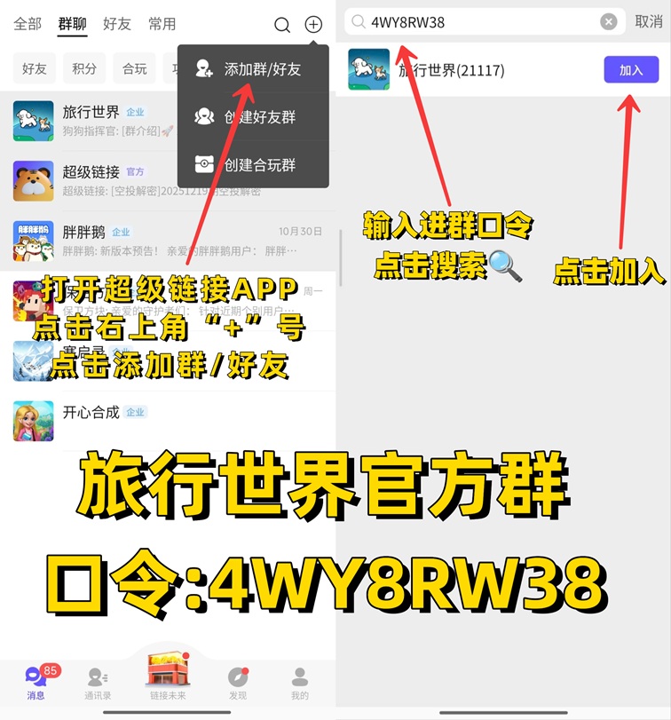 第二步:下載好超級鏈接APP,使用微信登錄,點(diǎn)擊右上角“+”號,點(diǎn)擊“添加好友”輸入旅行世界公司群口令“4WY8RW38”搜索,進(jìn)入旅行世界公司群。06m菜譜美食網(wǎng)-眾歸云 - 24小時不關(guān)機(jī)的云端電腦_云主機(jī)_VPS掛機(jī)寶_免費(fèi)掛機(jī)寶_0.1元試用,3-5元月租服務(wù)器提供