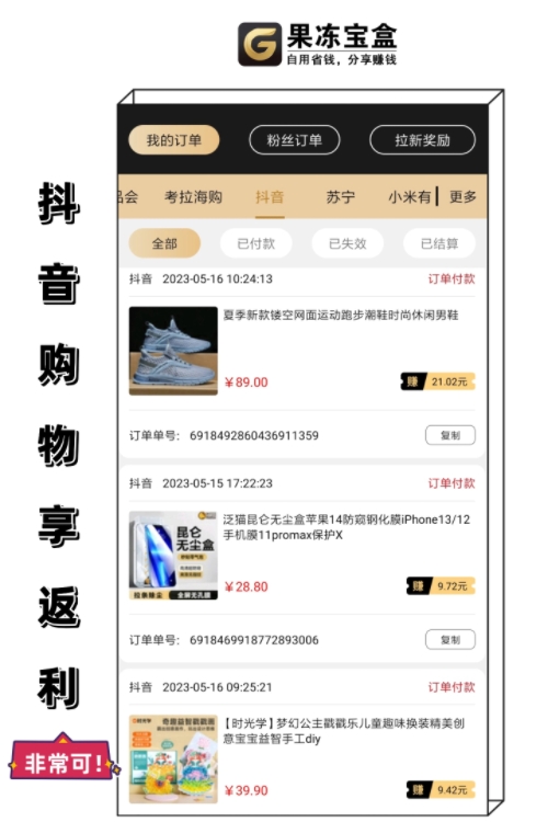 果凍寶盒 APP是一個(gè)提供優(yōu)惠券和返利服務(wù)的平臺(tái)。 與傳統(tǒng)返利APP不同, 果凍寶盒 APP的傭金機(jī)制主要依靠用戶的推廣合作。 用戶通過(guò)推廣果凍寶盒 APP并通過(guò)自己的邀請(qǐng)碼邀請(qǐng)他人成功注冊(cè)并使用優(yōu)惠券即可獲得相應(yīng)的傭金收入。 具體傭金比例及計(jì)算方法可在APP中查看。