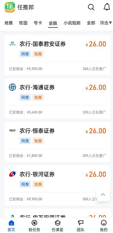 我們打開【金融】板塊就可以看到目前的10個農行證券項目了,這個10個項目可以一并進行操作,具體包括國海證券、國泰君安證券、財通證券、海通證券、恒泰證券、銀河證券、申萬宏源證券、中金證券、國信證券。lLx菜譜美食網-眾歸云 - 24小時不關機的云端電腦_云主機_VPS掛機寶_免費掛機寶_0.1元試用,3-5元月租服務器提供