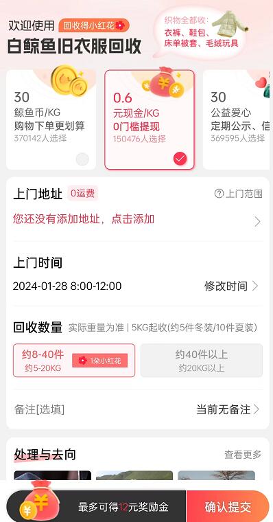 我們記得選擇回收方式的時候選擇現(xiàn)金就行,小紅花的話是用來抵扣商城消費的,肯定是現(xiàn)金更實在,目前每KG衣物的單價是0.6-1元,每次5kg起步。fep菜譜美食網(wǎng)-眾歸云 - 24小時不關機的云端電腦_云主機_VPS掛機寶_免費掛機寶_0.1元試用,3-5元月租服務器提供