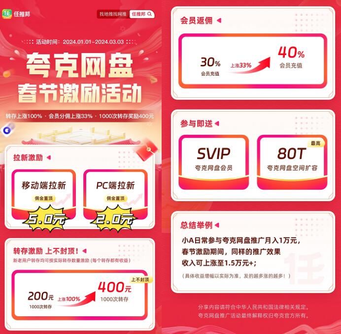 比如上面提到的任推邦平臺(tái)就是夸克網(wǎng)盤的一級(jí)服務(wù)商,直接對(duì)接夸克甲方,價(jià)格置頂公司直簽獨(dú)立后臺(tái)不扣量!光是23年就單是夸克網(wǎng)盤項(xiàng)目就派發(fā)了3000萬(wàn)的傭金,所以確實(shí)非常有實(shí)力,夸克網(wǎng)盤一手價(jià)格是拉新5元,然后會(huì)員分成30%轉(zhuǎn)存補(bǔ)貼每次0.2(限時(shí)活動(dòng)福利,會(huì)員分成40%而且轉(zhuǎn)存補(bǔ)貼4毛),其中拉新價(jià)格一般穩(wěn)定在5塊錢!N9l菜譜美食網(wǎng)-眾歸云 - 24小時(shí)不關(guān)機(jī)的云端電腦_云主機(jī)_VPS掛機(jī)寶_免費(fèi)掛機(jī)寶_0.1元試用,3-5元月租服務(wù)器提供