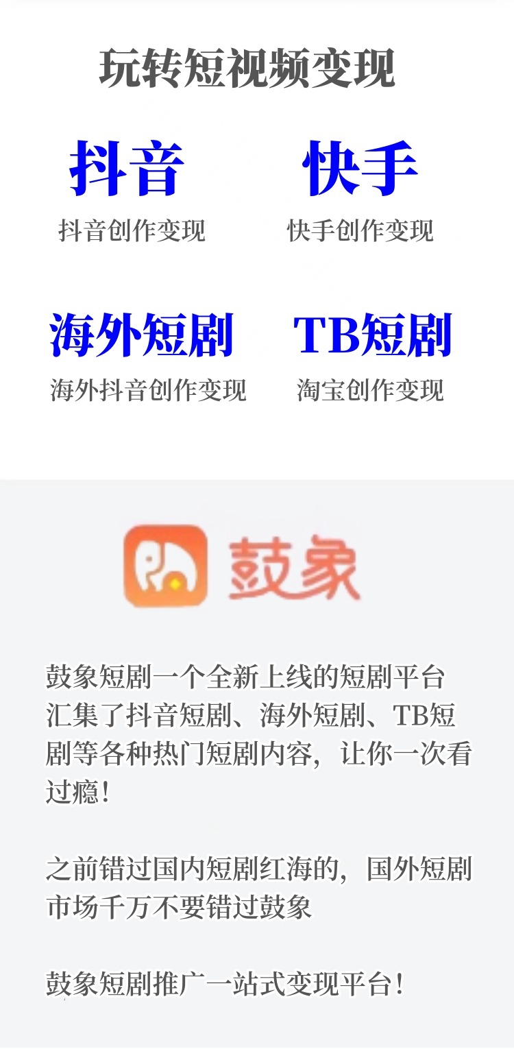 鼓象短劇最近真的很火爆,隨著短視頻的崛起,包括短劇也是越來越受到人們的歡迎,而鼓象短劇不僅囊括了市面各大短劇。還包括了海外短劇,淘寶短劇,這兩個是目前是首家!值得一提的是,鼓象短劇在這兩個新領(lǐng)域中均取得了令人矚目的成就,引領(lǐng)著整個短劇行業(yè)的發(fā)展方向,所以說現(xiàn)在做海外短劇CPS還是很有市場的,接下來小編跟大家聊聊鼓象海外短劇。