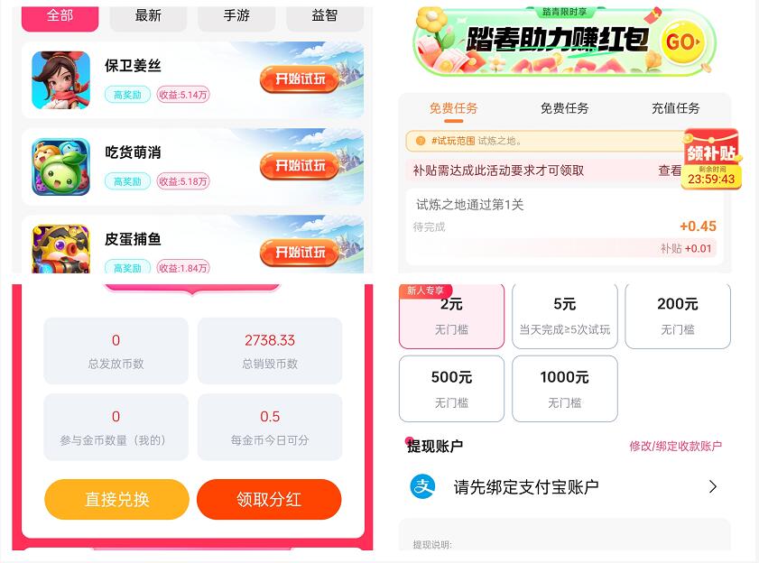 我們可以看下這個項目,首先點擊首頁可以明確看到這是一款游戲試玩軟件,隨便點擊一款可以知道目前這款游戲綜合單價不算高,起步0.45元,對比豆豆鉆的0.7+是差距頗大的;當(dāng)然平臺有一個份葒的玩法,我們做游戲試玩或者推薦下級可以獲得蛙幣即份葒幣等于說是有二次收益,這個蛙幣我們持有并非就可以每天份葒,而是需要比如邀請5人、看10個廣告、游戲試玩5次才能有資格份葒,并且我們持有的份葒如果2天沒有完成任務(wù),所有份葒幣就會銷毀,所以還是挺苛刻的;最后在體線門檻上,淘金試客首次2元后續(xù)必須每天完成5次試玩游戲才能體線5元,然后就是必須達到200元,所以其實這個項目在體線上面還是有彎道的,如果你不能保證每天玩5次試玩就得200元門檻!9wG菜譜美食網(wǎng)-眾歸云 - 24小時不關(guān)機的云端電腦_云主機_VPS掛機寶_免費掛機寶_0.1元試用,3-5元月租服務(wù)器提供
