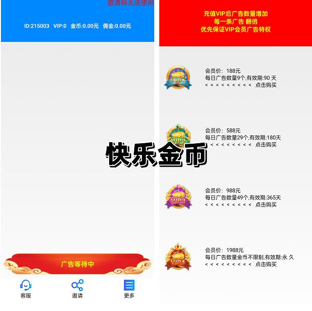 小編測(cè)試了一下,觀看2個(gè)廣告1塊錢(qián)可以進(jìn)行體線,到此為止都還算挺正常的,只不過(guò)我們繼續(xù)看下去會(huì)發(fā)現(xiàn)有VIP充值功能,充值之后每天廣告數(shù)量更多,最低188元到最高1988元(最高價(jià)格無(wú)限看廣告),其實(shí)這樣的行業(yè)邏輯本身就不合理,很簡(jiǎn)單的就是廣告掙米業(yè)務(wù)需要高曝光數(shù)量對(duì)接平臺(tái)才能掙米,如果還要設(shè)置加入門(mén)檻的話(何況這么門(mén)檻并不是為了區(qū)別用戶質(zhì)量來(lái)設(shè)定的)只會(huì)降低用戶數(shù)量降低平臺(tái)收益,除非平臺(tái)本身就是想著賺VIP充值的錢(qián);實(shí)際上,到了這一步小編已經(jīng)有印象了,其中這個(gè)軟件就是早幾年一直都存在,經(jīng)常用掛機(jī)廣告作為噱頭,就是掛機(jī)一直有收益每天幾十塊,然后讓你體線1塊5毛錢(qián)這樣,誘導(dǎo)用戶進(jìn)行充值才能繼續(xù)體線,基本99%無(wú)疑是一家最起碼有關(guān)系的,所以這個(gè)項(xiàng)目小編可以確定不是正規(guī)廣告項(xiàng)目,就是賺VIP充值為目的的ZJP類(lèi)項(xiàng)目,小編可以確定這個(gè)除了一開(kāi)始1塊錢(qián)其他你不充值是無(wú)法體線的。LHI菜譜美食網(wǎng)-眾歸云 - 24小時(shí)不關(guān)機(jī)的云端電腦_云主機(jī)_VPS掛機(jī)寶_免費(fèi)掛機(jī)寶_0.1元試用,3-5元月租服務(wù)器提供
