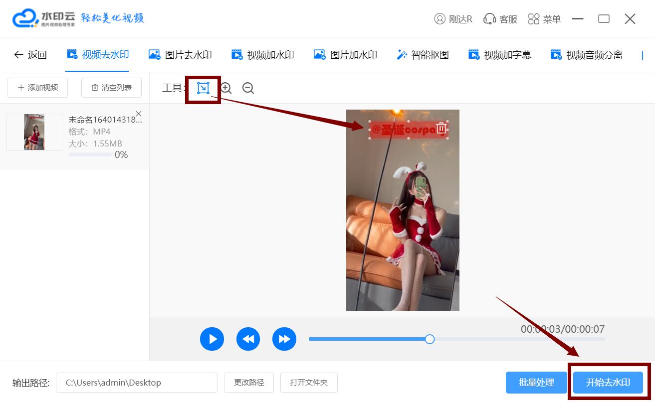 2.將視頻添加到這個面板上,后面有個「視頻去水印」功能,點擊就能處理,只需要拖動矩形框,將水印覆蓋即可。QSS菜譜美食網(wǎng)-眾歸云 - 24小時不關機的云端電腦_云主機_VPS掛機寶_免費掛機寶_0.1元試用,3-5元月租服務器提供