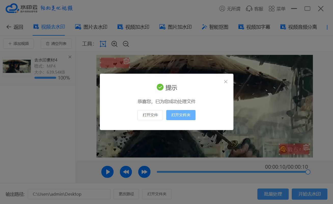 第三步:框選完成后,點(diǎn)擊“開始去水印”,等待處理,完成后會(huì)有提示框顯示處理完成,會(huì)默認(rèn)保存到電腦桌面。FV1菜譜美食網(wǎng)-眾歸云 - 24小時(shí)不關(guān)機(jī)的云端電腦_云主機(jī)_VPS掛機(jī)寶_免費(fèi)掛機(jī)寶_0.1元試用,3-5元月租服務(wù)器提供