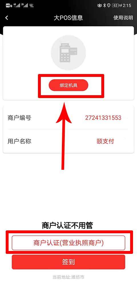 3.在收款界面,點(diǎn)擊“大POS機(jī)收款”,然后綁定機(jī)具后,就可以在這里收款了。如果不知道機(jī)具型號(hào),可以在手中的POS機(jī)背面查看即可。